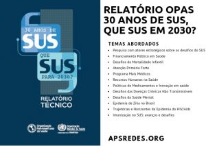 A Organização Pan-Americana da Saúde (OPAS) apresentou nesta terça-feira (27) o Relatório 30 Anos de SUS, que SUS para 2030? que reúne recomendações para a sustentabilidade do sistema de saúde, especialmente, para os próximos 12 anos quando os países vão demonstrar se atingiram as metas de Objetivos do Desenvolvimento Sustentável, estipulada pela Organização das Nações Unidas