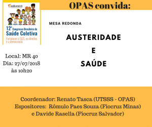 A mesa redonda “Austeridade e Saúde” será mais um dos destaques do Congresso Abrascão, no Rio de Janeiro. Os pesquisadores Rômulo Paes Souza (Fiocruz Minas) e Davide Rasella (Fiocruz Salvador) apresentam os resultados da pesquisa que prospecta os efeitos da austeridade fiscal na mortalidade em menores de cinco anos no Brasil entre 2017 a 2030. O debate,
