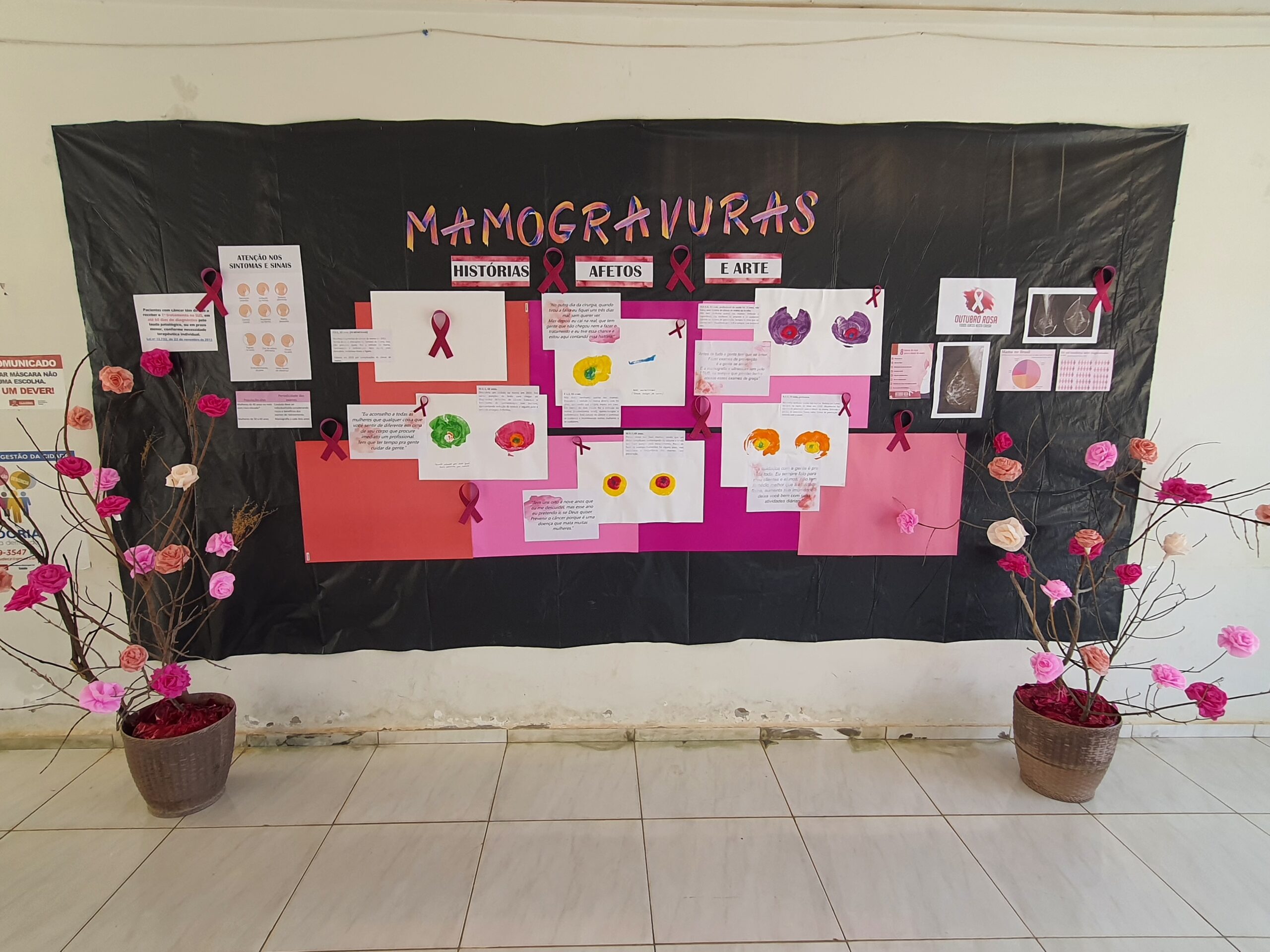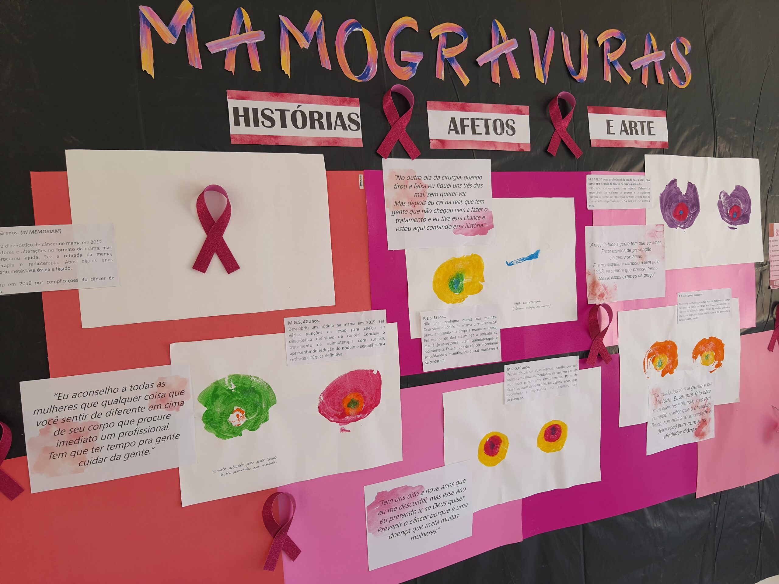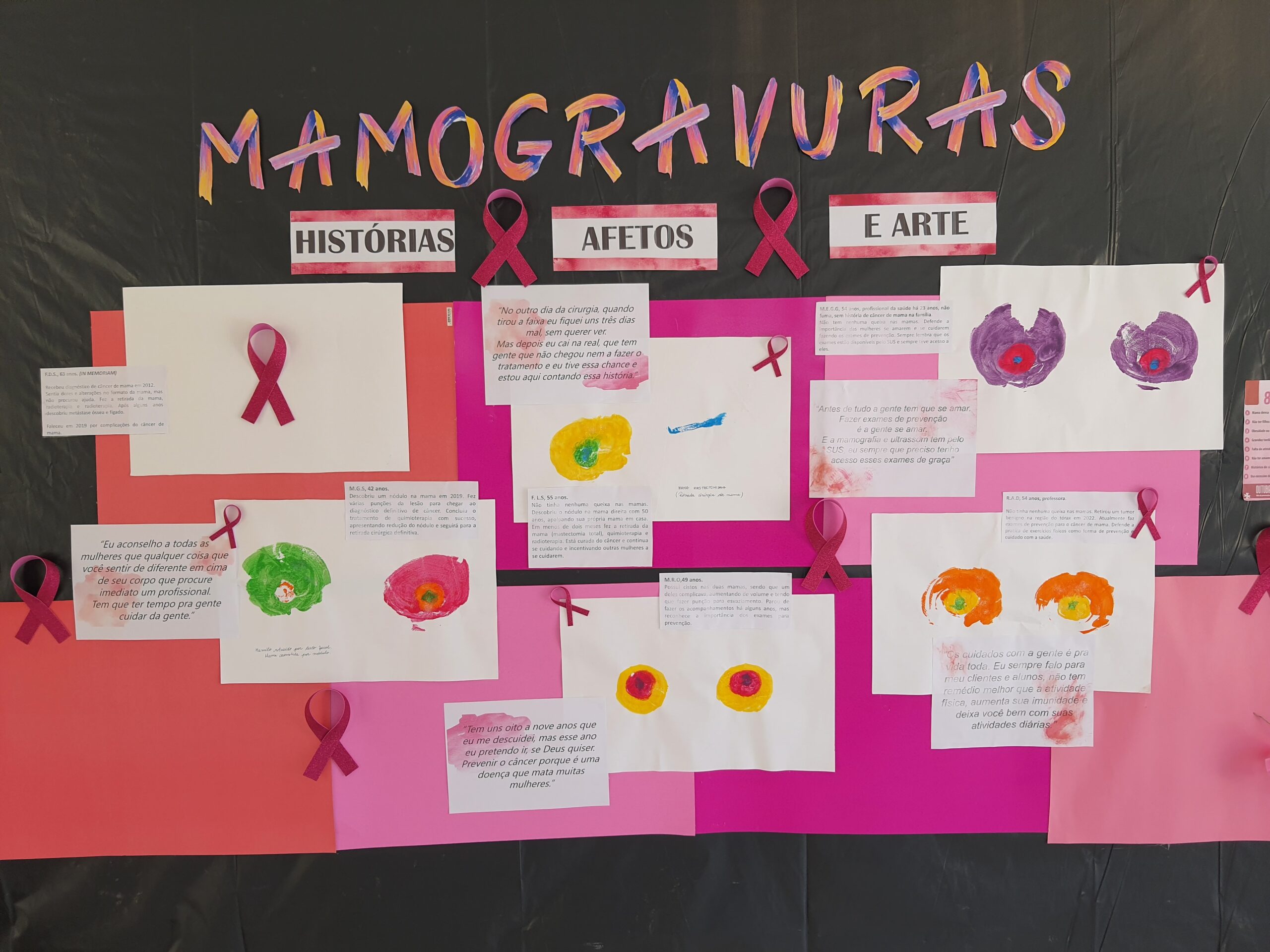 Painel interativo realizado por meio de pinturas das mamas de mulheres que vivenciaram o processo de adoecimento do câncer de mama, através da técnica de “carimbo”, por meio de visitas domiciliares e diálogos gravados. As pinturas e depoimentos deram material para o painel exposto na unidade durante o mês de outubro e os depoimentos, transformara-se em um vídeo educativo e sensível veiculado na unidade todos os dias na recepção.